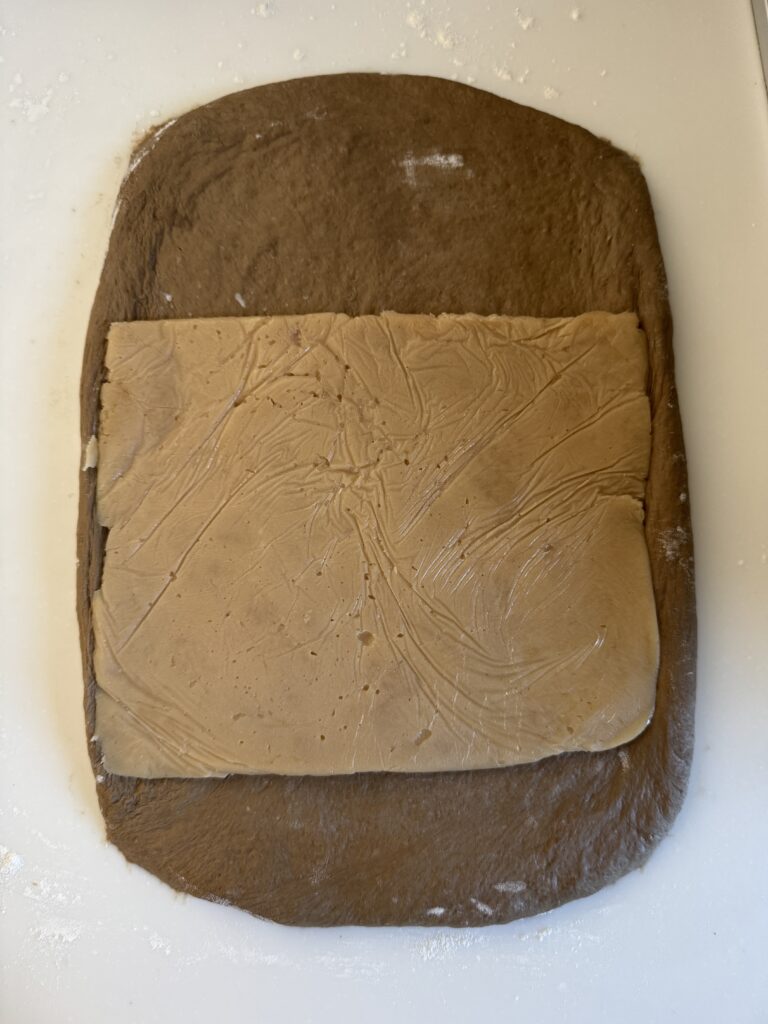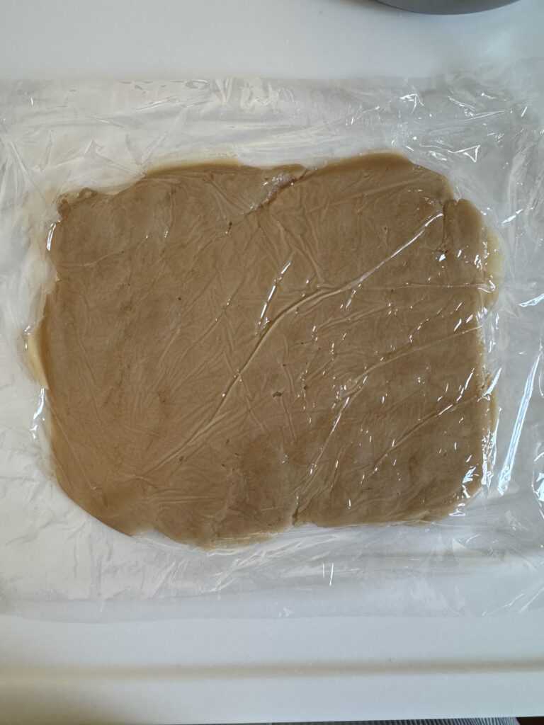 • サランラップかオーブンペーパーでフィリングを挟み、めん棒で優しく伸ばしながら30cm x 15cmの大きさ(3mm厚さ)に広げる