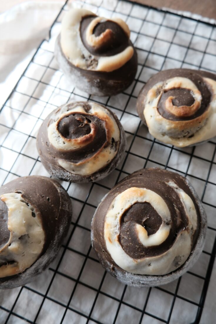 • 手前からくるくると巻いていき、巻き終わりをしっかりと指で摘んで閉じる。作業台に生地がくっついてしまう場合には、スクレーパーで優しく剥がしながら巻いていく